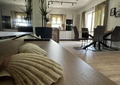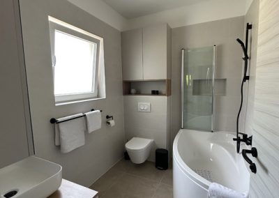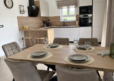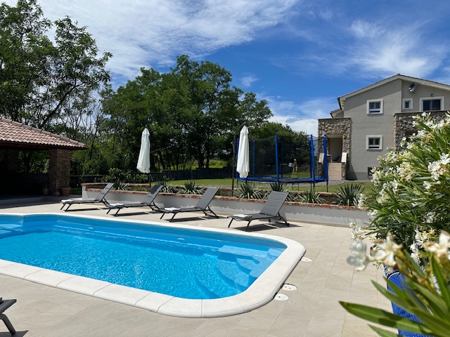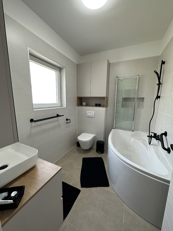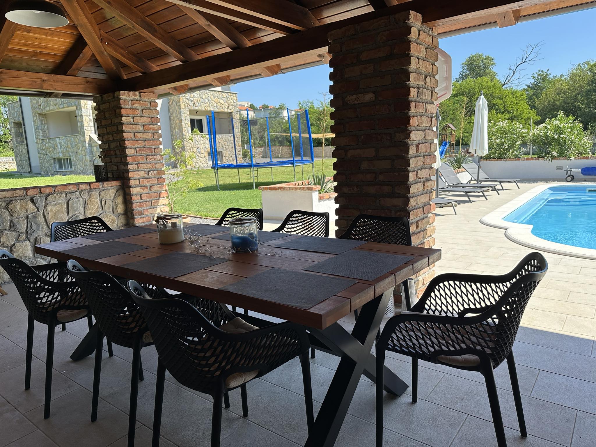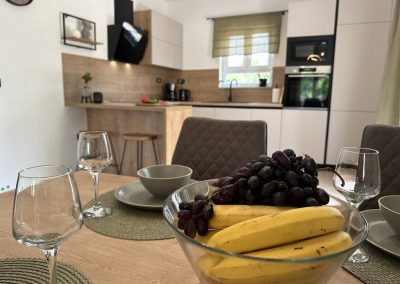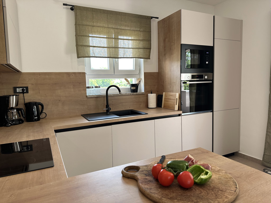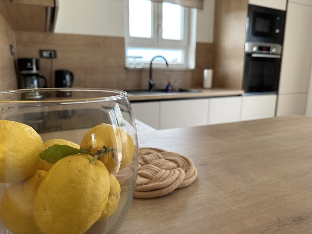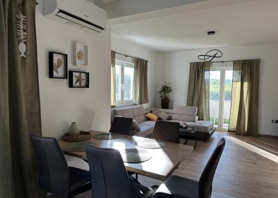 Sigurni smo da ćete svoj odmor većinom provesti uz bazen, ali isto tako smo sigurni da ćete uživati u interijeru vile. Unutra ćete pronaći elegantno namješten interijer koji odiše udobnošću i sofisticiranošću. Vila se sastoji od 2 odvojena stana koji su povezani stubištem. U prizemlju ćete pronaći apartman s dvije luksuzno opremljene spavaće sobe, od kojih je svaka utočište mira, osiguravajući miran san, dvije kupaonice, udoban dnevni boravak okupan prirodnim svjetlom, stvarajući topao i privlačan ambijent, te potpuno opremljenu moderna kuhinja koja ispunjava vaše kulinarske želje i omogućuje vam pripremu ukusnih jela u kojima ćete uživati u blagovaonici. Na prvom katu nalazi se još jedan stan sa svijetlim dnevnim boravkom i modernom kuhinjom te dvije spavaće sobe i dvije kupaonice. Apartman također ima terasu na kojoj možete uživati u zalascima sunca u večernjim satima i popiti kavu na suncu ujutro.